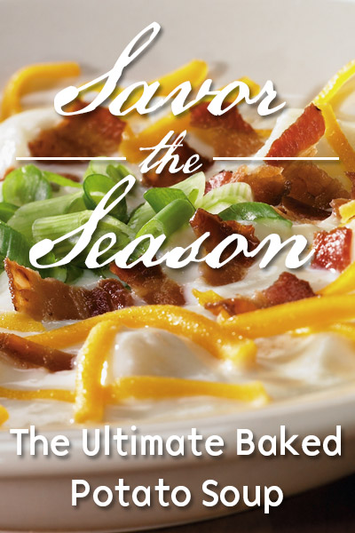 Deliciosa sopa con trocitos de papa, espolvoreada con queso Colby, tocino y cebollín.